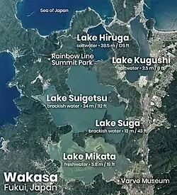 Annotated aerial view of the Mikata Five Lakes in Wakasa, Fukui Prefecture, Japan (2018/2023). Measurements refer to maximum depth.