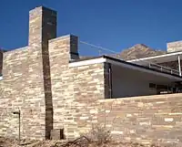The Wallace E. Pratt House, also known as Ship on the Desert (sometimes hyphenated), was the residence of Wallace Pratt in what is now Guadalupe Mountains National Park in far western Texas. Pratt, a petroleum geologist for the Humble Oil & Refining Company, had previously built the Wallace Pratt Lodge in McKittrick Canyon a couple of miles to the north in the Guadalupe Mountains. Finding the cabin site to be remote and prone to being cut off by flooding, Pratt started construction of a new, modern residence on the east slope of the mountains. Work on the residence started in 1941. The house was designed by Long Island architect Newton Bevin, who lived for a time at the site with his wife, and built by contractor Ed Birdsall. Work was stopped by World War II, but resumed in 1945 and was completed the same year. In contrast to Pratt's rustic canyon cabin, the house, which Pratt named the Ship On The Desert, is an International Style house with horizontal lines and extensive glazing.[3] Only 16 feet (4.9 m) wide and 110 feet (34 m) long, the house provides broad views to the east over the plains and the west to the mountains. The majority of the house is on a single level, with a "captain's bridge" over the dining room giving access to a rooftop terrace. A detached garage contained a guest bedroom. Apart from glass, the predominant material was local limestone in several shades.[4]