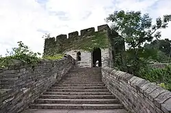 The layout of the Walled City is roughly square, with a total perimeter of approximately 6,287 meters.[5] The city walls extend primarily from the northeast to the southwest, standing 7 meters high, and feature four gates, defensive towers, and eight bastions. The design takes advantage of the terrain; on the north side, it stretches along the ridge of Beigu Mountain to the east bank of the Ling River, and to the west, it reaches the western foothills of Jin Mountain, creating a defensive system that backs onto Beigu Mountain and faces the Ling River. The northern section, built along the mountain, is the most formidable due to its terrain.[6] The western and southern sides, which face the river, have a combined length of 2,370 meters. The eastern wall, which was 1,615 meters long, was demolished in 1956, while the northern wall, 2,300 meters long and situated along the ridge line, was rebuilt in the 1990s based on the original foundations.[5]