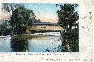 The Walloomsac River (/ˈwɑːluːmsæk, ˈwælʊmsɪk/) from the Native American name, Wal-loom-sac[1] is a 16.8-mile-long (27.0 km)[2] tributary of the Hoosic River in the northeastern United States. It rises in southwestern Vermont, in the Green Mountains east of the town of Bennington in Woodford Hollow at the confluence of Bolles Brook and City Stream where it is labeled Walloomsac Brook on maps[3][4] but is locally known as "The Roaring Branch". The river then flows west toward Bennington and passes the downtown area to the north. For many years this section was intermittent due to the water having been diverted to power mills in town (ca. 1810).[5] This divergence gave the name Walloomsac to a portion of the river flowing through town on the present course of South Stream.[3][4] The combined Walloomsac / South Stream joins the Roaring Branch northwest of town. From here the river flows westward as the Walloomsac River and joins the Hoosic River below Hoosick Falls, New York.
