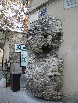 In late antiquity a rudimentary wall was erected by reusing material from Roman monuments. It was centred on the Rocher des Doms and enclosed a much smaller area than the Roman town.[3][4] This wall is mentioned by the Gallo-Roman historian Gregory of Tours when describing the siege of the town by the Frankish king, Clovis I, in around 500 AD.[4][5]