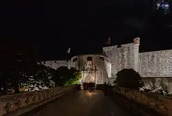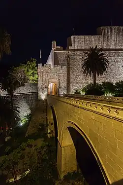 The Pile Gates are a well-fortified complex with multiple doors, defended by Fort Bokar and the moat that ran around the outside section of the city walls.[11] At the entrance gate to the Old Town, on the western side of the land walls, there is a stone bridge between two Gothic arches, which were designed by the architect Paskoje Miličević in 1471. That bridge connects to another bridge, a wooden drawbridge which can be pulled up.[17] During the republican era, the wooden drawbridge to the Pile Gate was hoisted each night with considerable pomp in a ceremony which delivered the city's keys to the Ragusan rector. Today, it spans a dry moat whose garden offers respite from crowds. Above the bridges, over the arch of town's principal gateway, there is a statue of city patron Saint Blaise (Croatian: Sveti Vlaho), with a model of the Renaissance city. After passing the Pile Gate's original Gothic inner gateway, it is possible to reach one of a three access points to the city walls.[14]