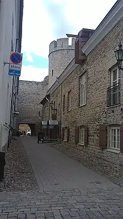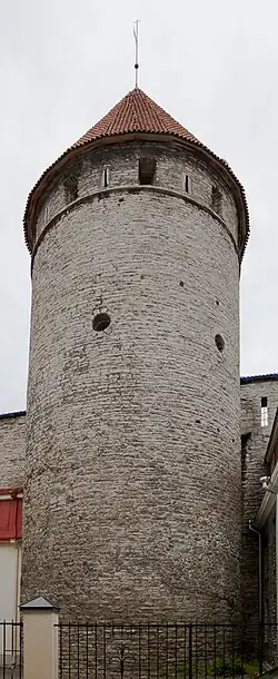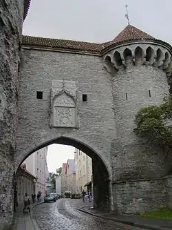 The first wall around Tallinn was ordered to be constructed by Margaret Sambiria in 1265 resulting in its name, the 'Margaret Wall.' This wall was less than 5 metres (16 ft) tall and about 1.5 metres (4.9 ft) thick at its base.[1] Since that time it has been enlarged and strengthened. The walls and the many gates are still largely extant today. This is one of the reasons that Tallinn's old town became a World Heritage Site. The walls were enlarged in the fourteenth century, and citizens of Tallinn were required to turn out for guard duty, which meant to wear their armour and demonstrate their readiness to face invaders.[2]