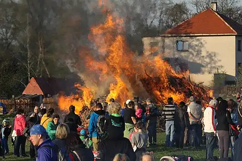 30 April is Pálení čarodějnic ('Burning of the witches') or čarodějnice ('The witches') in the Czech Republic. Huge bonfires up to 8 metres (26 ft) tall with a witch figure are built and burnt in the evening, preferably on top of hills. Young people gather around. Sudden black and dense smoke formations are cheered as "a witch flying away". An effigy of a witch is held up and thrown into a bonfire to burn.[1]