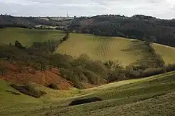 A bridle path runs from Calcot Hill Farm, along the southern face of the Walton Hill to the hamlet of Walton Pool. This crosses a footpath from Belbroughton and the A491 across farmland on its way towards the summit. From Walton Pool, a hamlet in the parish of Clent, two bridle paths follow the lines of two ridges, and meet to form the main south western spine of Walton hill. To the north west of Walton Pool there is a footpath which starts at St. Leonards church, the Parish church in Clent, and joins one of the two bridleways emanating from Walton Pool. Another path starts in the hamlet of Clatterbach, near the Vine Inn in Clent village and this allows direct access to the north western flank of Walton Hill.[1]