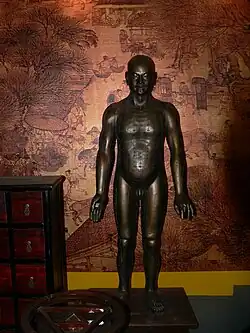 Acupuncture has been known since at least several centuries prior, and body models were being created earlier too (e.g. lacquer figurines excavated from a Han dynasty tomb[2]), but the ones created by Wang Weiyi were much more precise and of human size. They are sometimes called Tiansheng Bronze Figures (天聖銅人; 天圣铜人) after the era name in which they were constructed.[b] The two man-sized bronze figures were designed with care about the actual human body proportion. They were engraved with 354 acupoints – 4 millimeter deep, marked with names and connected according to the twelve meridians. The limbs were movable and disassemblable. Inside the bronze trunk, there were internal organs and skeleton made of wood. Replacing paper models with this three-dimensional apparatus was a great improvement in teaching and examination: the outside of the bronze statue was first covered with wax to seal the acupoints and water (or mercury) was poured inside the dummy. If the needle was inserted by the examinee into the correct acupoint, water or mercury would ooze out.[1]