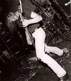 War Babies, featuring the line-up of Brad Sinsel (vocals), Tommy "Gunn" McMullin (guitars), Guy Lacey (guitars), Shawn Trotter (bass), and Richard Stuverud (drums) scored a contract with Columbia Records in 1991. They recorded their debut album, War Babies (1992) at A&M Studios in Hollywood, CA with noted producer, Thom Panunzio and engineer, Bill Kennedy.[2] Their first single and MTV video, "Hang Me Up", was co-written by McMullin and Paul Stanley of Kiss. Two other singles were released, "Blue Tomorrow" (a song dedicated to Andrew Wood, who was a friend of Sinsel and McMullin's), and the power ballad, "Cry Yourself to Sleep", co-written by Sinsel and Stanley.[3] The song "In The Wind" can be heard in the 1992 film Buffy the Vampire Slayer but was not included on the official soundtrack.