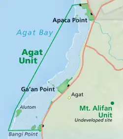 The Agat Unit on the south side of the Orote Peninsula comprises land, surface, and subsurface assets in Agat Bay and the villages of Agat, Guam and Santa Rita. It extends from Apaca Point south to Bangi Point, including Alutom Island. A park at Ga'an Point includes several defensive structures and two types of guns.[8] NRHP-listed resources here include: