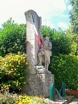 Crépy-en-Valois 1925 Crépy-en-Valois's war memorial by Albert Bartholomé features a woman weeping over the corpse of a dead soldier, a replica of the "le soldat gisant" statue commissioned in 1918 by Marie Henriette Bernard de Sassenay, for the tomb of her son, Jacques Benoist de Laumont. Albert Bartholomé completed the Crépy-en-Valois sculpture for free in memory of his deceased wife who had been born in the nearby village of Bouillant. It was inaugurated on 11 November 1925.[16] It was Albert Bartholomé who was responsible for the famous Monument aux Morts in the Pere Lachaise cemetery. See detail from this Monument aux Morts below. There is also a notable Bartholomé sculpture in nearby Bouillant this being for the grave of his wife.[17]