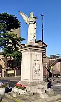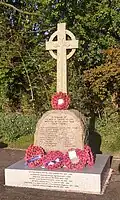12 June 1920 | Tall tapered Celtic cross on a square tapered plinth. The sides of the plinth have the names of the First World War casualties inscribed. At the base is a separate semi-raised marble tablet listing the World War II casualties.[6][7] | None | |
