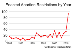 Zerlina Maxwell, in an editorial for U.S. News & World Report, cited these figures from the Guttmacher Institute as evidence of a "war on American women".[10] The findings, according to the Guttmacher Institute, show that state restrictions on abortion greatly increased in 2011.[48][49][50]
