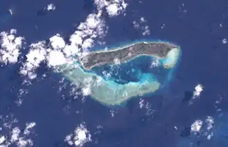 The island is located 12 km south-east of the Lebrun Islands and 16 km northwest of the Stuers Islands. Wari is approximately 4.7 km long and up to 630 meters wide. It has an area of 2.27km2. Over the entire length of the island extends a narrow mountain chain that ends in the east and west respectively with a steep peak. The western mountain is 117 m high. A large coral reef is located off the southern coast of Wari. East Islet and South Islet (Kera Kera) are lying on the same coral reef at a distance of 400 and 950 meters respectively. 1.3 km northwest of the western tip of Wari stands an 81 metre-high steep rock out of the sea, Ikaikakeino Island (Cliff Rock). 3.8 km to the northwest is the 133 metre-high rock Mamaramamaweino (Bell Rock). Wari was once forested, but now almost bare, the trees were cut down to make firewood for the population.[4]