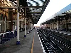 It had (and still has) two platforms on either side of two running lines with a subway between them at the Winwick Street end. This subway was later opened out to provide access direct from Winwick Street to each platform. Although the train timetable has often included passenger train services terminating at Warrington Central, there have never been any bay platforms. Terminating services use one of the two through platforms and usually proceed afterwards, as empty coaching stock, into the sidings to the east of the station[8]