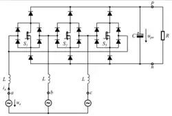 The Warsaw rectifier is a unidirectional, three-phase, three-switch two-level pulse-width modulation (PWM) rectifier. This topology uses three insulated-gate field-effect transistors (IGFET) and eighteen diodes. The bidirectional switches (composed of four diodes and one IGFET circuit) are connected in a delta topology. The rectifier output does not require a divided DC-link circuit as required in the Vienna rectifier topology.[4][5]