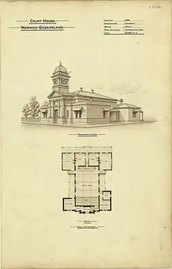1. ^ a b c d e f g h i j k l m n o p q r s t u v w x y z aa ab ac ad ae af ag ah ai aj ak al am an "Warwick Court House and Police Complex (entry 600948)". Queensland Heritage Register. Queensland Heritage Council. Retrieved 1 August 2014.