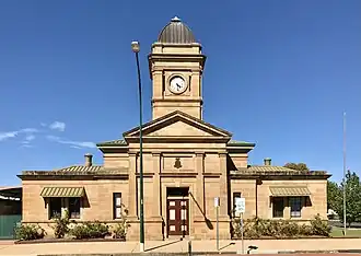 The court house is a single-storeyed (with attic) sandstone structure located on the corner of Guy Street fronting Fitzroy Street to the north. The building has a hipped sheet metal roof, with metal ridge ventilators, and a clock tower on the Fitzroy Street frontage.[1]