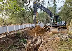 The bolts securing the rail to its sleepers have pulled out of the wood occasionally, especially where the Boxer had derailed. This was caused by the weight of the tracked Boxer locomotive pushing down upon the sleepers at a point where they were not well supported. Some of the weight of the Boxer is normally borne by the rails, via its rear steel wheels.[9] Some sleepers disintegrated during the use and some sections needed to be supported by broken branches rammed into cavities under the track. However, as the trains moved slowly, nobody was hurt in occasional derailments and little damage was done.[6] At the conclusion of the drain in-filling, the rail tracks were removed.[10] The project was successfully completed on 19 November 2009.[11]