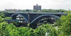 The Washington Bridge is an arch bridge over the Harlem River composed two large steel arches flanked at either end by masonry viaducts.[4] Its total length, including approaches, is 2,375 feet (724 m).[5][6] It connects West 181st Street in Washington Heights, Manhattan, with University Avenue in Morris Heights, Bronx.[7][8][9] Within the bridge's vicinity, the Harlem River is in a valley between Manhattan to the west and the Bronx to the east;[10][11] the terrain on the Manhattan side is steeper than on the Bronx side.[11]