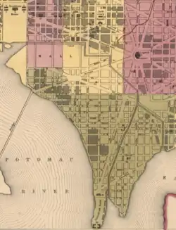 The canal was opened formally during late 1815.[6] The canal route began at the Eastern Branch, near the Washington Navy Yard and proceeded north and northwest. Another planned branch proceeded north and northeast from the estuary of James Creek, which divided Greenleaf Point from Buzzard Point but was only constructed in 1866 and never connected with the existing canal.[7] Past the point at which these two branches were planned to converge, a single canal channel traveled northward towards the Capitol, veered northwestward at the base of Jenkins Hill (Capitol Hill), and then turned again to the north to cross the area in which the National Mall is now located. The canal then turned sharply to the west, joining a straightened and channelized Tiber Creek, which had earlier flowed westward. After traveling westward along the route of Tiber Creek, the canal entered the Potomac River at the outlet of the creek, which was south of the White House.