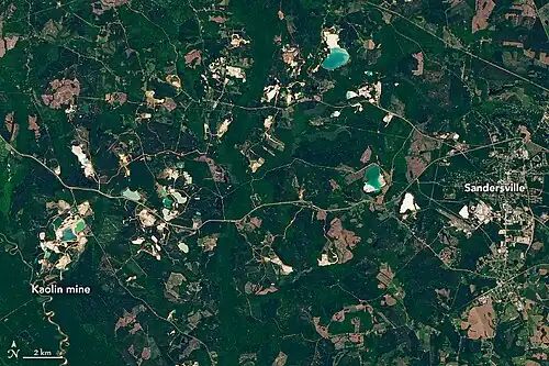 Kaolin mines are a major industry in Washington County. Kaolin has had a particularly strong impact on the town of Sandersville which brands itself as the “kaolin capital of the world.” Each October, the town hosts a festival that includes a parade of heavy mining machinery, kaolin mine tours, and a beauty pageant that crowns Miss Kaolin.[19]