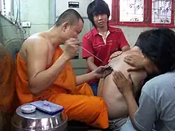 Right before reaching the monk, the people next in line to the one being tattooed will assist the monk with holding the one receiving the tattoo still. The monk uses a single long thin needle about 18 inches in length and about four millimeters in width. The tip of the spike is split into two (like a split cane), so that each stab of the spike produces two dots of ink in the skin. There are about 8 of these needles in a pot of a type of cleaning solution. Sometimes the monk will sharpen the needle with fine grade sandpaper before beginning. The monk will then select from several different rubber templates with the design of choice. He will apply the template to ink and then press it on to the recipients back to transfer the design. When ready to begin, he will dip the tip of the needle into a mix of oil, probably palm oil, Chinese charcoal ink, and possibly snake venom. He then begins to trace the pattern. The typical tattoo takes about 3,000 strikes to complete. The monk dips the needle into the ink about every 30 seconds. When complete, he blesses the tattoo and blows a sacred Kata (Ghata) on it to infuse it with power. For men, the monk uses the charcoal ink. For women he uses a transparent ink and will use a glove in order to not touch the female body.