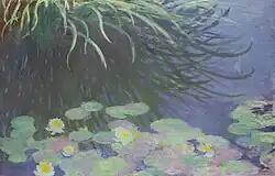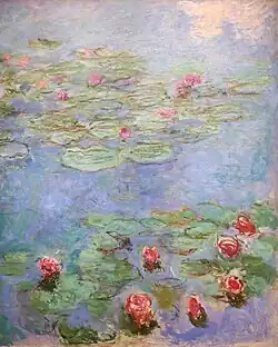 Water Lilies (French: Nymphéas [nɛ̃.fe.a]) is a series of approximately 250 oil paintings by French Impressionist Claude Monet (1840–1926). The paintings depict his flower garden at his home in Giverny, and were the main focus of his artistic production during the last 31 years of his life. Many of the works were painted while Monet suffered from cataracts.[1][2]