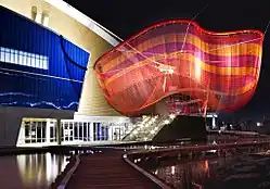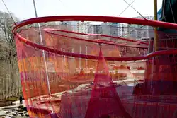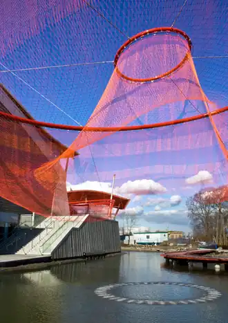 Water Sky Garden is a sculptural environment designed by artist Janet Echelman. The garden is located outside the Richmond Olympic Oval, an official venue for the 2010 Vancouver Olympic Games. The installation consists of a wetland treatment pond, 300 ft. boardwalk, two 52 ft. pedestrian bridges, two net sculptures, and a fountain.