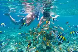 Water clarity also affects how humans interact with water, from recreation and property values to mapping, defense, and security. Water clarity influences human perceptions of water quality, recreational safety, aesthetic appeal, and overall environmental health.[10][11] Tourists visiting the Great Barrier Reef were willing to pay to improve the water clarity conditions for recreational satisfaction.[12] Water clarity also influences waterfront property values. In the United States, a 1% improvement in water clarity increased property values by up to 10%.[13][14][15][16] Water clarity is needed to visualize targets underwater, either from above or in water. These applications include mapping and military operations. To map shallow-water features such as oyster reefs and seagrass beds, the water must be clear enough for those features to be visible to a drone, airplane, or satellite.[17][18] Water clarity is also needed to detect underwater objects such as submarines using visible light.[19][20][21]