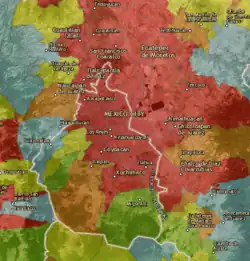 To prevent urbanization, a total of 182 Federally Protected Natural Areas (NPA) have been declared throughout the country and cover 90,893,522 hectares.[24] Additionally, state protected areas exists: Mexico City has a total of 23 NPAs, covering a total of 26,047 hectares.[25] The State of Mexico has a total of 88 NPAs, covering a total of 983,984 hectares.[26] Despite this, the Mexico City Metropolitan Area (MCMA) has grown physically and demographically since the 1930s. It spreads over a surface of 4,250 km2 and has a metropolitan population of approximately 21.2 million, concentrating 18% of the country's population.[21] It covers over 16 boroughs of Mexico City and 34 municipalities of State of Mexico.