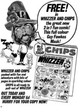 Whizzer and Chips was a British comics magazine that ran from 18 October 1969 to 27 October 1990, when it merged with the comic Buster. As with most comics of the time, Whizzer and Chips was dated one week ahead of the day it actually appeared on newsstands in Great Britain (the date referred to the day the comic needed to be taken off the shelves to make way for the new issue, rather than a release date). It had no relation to the earlier British comic Illustrated Chips (which ran from 1890 to 1953).