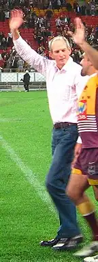 That year, he received the Rugby League International Federation's coach of the year award.[24] However, on 9 December 2005, it was announced that Bennett had resigned as Australia's coach after the Kangaroos lost an international series for the first time in 27 years,[25] and equalled their biggest loss in 98 years, going down 24–0 to New Zealand in the final of the 2005 Tri-nations series. In 2006 a secret deal being brokered between Bennett and the Sydney Roosters club for him to become their coach was made public. This is said to have caused the deterioration in his relationship with the Broncos management which eventually led to his resignation.[26] During the 2006 finals series, Bennett became the second person (after Tim Sheens) to coach 500 premiership games. He also signed on to continue coaching the Broncos for a further two years.[27] The sixth premiership final won by Brisbane against Melbourne made Wayne Bennett the most successful Grand Final coach in history.[28] He again was named Queensland's Sport Coach of the Year for 2007 and was made a life member of the Broncos club. His refusal to make an acceptance speech at the club's presentation ball showed the strain in his relationship with the Broncos.[29] Bennett coached the 2007 All Golds.[30] In doing so, he introduced the New Zealand players to the Queen and the Duke of Edinburgh.[31]