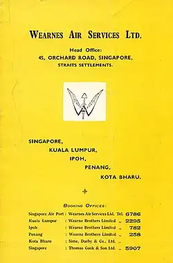 The achievements of Wearne's Air Service in the 1930s garnered notable attention, prompting a collaborative effort between the Imperial Airways (later known as the British Overseas Airways Corporation or BOAC), Straits Steamship Company, and Ocean Steamship Company of Liverpool. This alliance culminated in the establishment of Malayan Airways (MAL) on October 12, 1937. Nonetheless, MAL experienced a period of inactivity as its leadership recognised the inherent difficulties in competing with Wearne's Air Service's already established dominance, additionally heightened by the relatively small market size.[34] Moreover, amid the impending European conflict, the prospect of war reaching Malaya loomed large. In response, a strategic decision was made to conserve resources, deferring market entry until more favorable circumstances arose.[35]