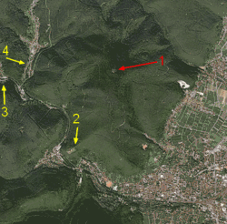 The eastern spur of the Weinbiet massif, the 316-metre-high Nebelberg (Nöpelberg), is quite striking and runs for almost two kilometres to the edge of the graben fault. Whilst the Gimmelding quarry on the east side of the Nebelberg had been abandoned by the middle of the 20th century, the Haardt quarry on the south side is still working.