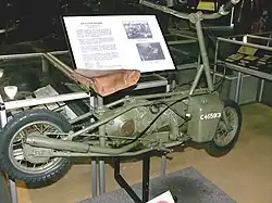 The Welbike is a British single-seat folding motorcycle produced during World War II at the direction of Station IX — the "Inter Services Research Bureau" — based at Welwyn, UK, for use by Special Operations Executive (SOE). It has the distinction of being the smallest motorcycle ever used by the British Armed Forces.[1] Between 1942 and 1943, 3,641 units (plus a prototype and some pilot models) were built and, although not much used by the SOE, some were issued to the British 1st and 6th Airborne Divisions and some were used at Arnhem during Operation Market Garden.[2]