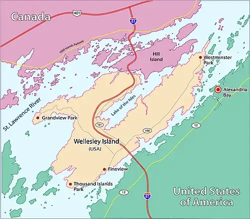 Wellesley, one of the largest of the Thousand Islands in the St. Lawrence River. Population increases dramatically during the summer months. The island has two State Parks, a nature center, and three golf courses. Located on its southern tip is Thousand Island Park, listed on the National Register of Historic Places in 1982.[2] In addition to Interstate 81, which connects two portions of the Thousand Islands Bridge, Jefferson County Routes 100 and 191 serve the island.