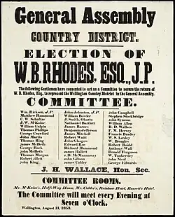Election poster in support of William Barnard Rhodes, standing for Wellington Country in 1853