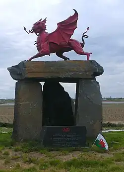 The bronze dragon on top of the memorial was created by Lee Odishow, whose design was chosen from a selection of four artists.[2] The general design (cromlech, surmounted by a dragon) is from Erwin Ureel MBE (originator of the Memorial idea) and Peter Carter Jones BEM (Chairman of the Welsh Committee). It takes the form of a cromlech, an edifice common to Celtic peoples, composed of three large upright blue pennant stone slabs and a large flat slab on the top. The cromlech is surmounted with an 8 ft red bronze dragon. The stone came from the Graig quarry in Pontypridd. The memorial is inscribed "To all those of Welsh descent who took part in the First World War between 1914 and 1918." [3]