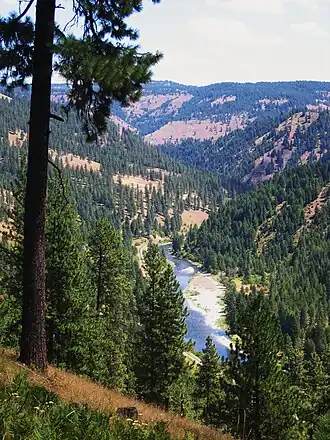 The Wenaha River is considered a Type IV channel under the Rosgen Stream Classification, characterized by a shallow rocky bed interspersed with deep pools.[3] Although the river flows through a rugged, mountainous region, its gradient is relatively low at 1.1 percent, and is bordered by floodplains with dense riparian hardwood forests along its valley floor.[25] These characteristics contrast with the nearby Grande Ronde and Snake Rivers, which have steeper gradients and less floodplain area.[26] There are no dams or channel modifications on the Wenaha River and its tributaries; although there are a few water rights within the basin used for domestic and livestock water supply, they account for a tiny portion of the river's flow.[3] The river is considered a critical habitat for spring chinook salmon, steelhead trout and bull trout (formerly considered the same as Dolly Varden trout).[26] The Forest Service reported in 2000 that "the Wenaha River system may be one of the best bull trout populations remaining in Oregon."[27]: 3–52  Other fish species include rainbow trout, redband trout, and mountain whitefish.[3]