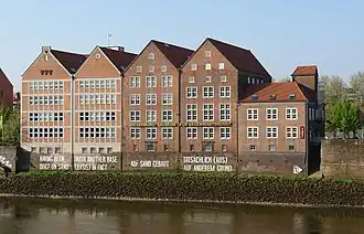In 1893, a cigarette factory was opened by Ad. Hagens & Co. on the Teerburg Peninsula in the middle of the Weser. Known as Hagensburg, the building's two Neogothic gate towers contrasted with the surrounding warehouses. After the Schilling Brothers (Gebrüder Schilling) acquired the building in 1923 for a coffee factory, the name was changed to Weserburg. Almost totally destroyed in the Second World War, the building was repaired and reopened in 1949. When the factory closed in 1973, the building was sold to the city. It was used for various cultural purposes including artists' ateliers and art exhibitions, until it was decided it should become a collectors' museum.[2]