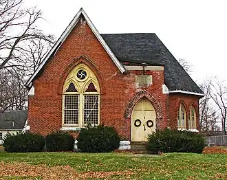 Built of brick on a stone foundation,[3] the church features a distinctive pyramid-shaped roof above the 1888 addition. At one time, the church also included a tower above the entrance; the tower was the portion of the building hit by the 1926 lightning strike, and it was removed as a result.[2] The various architectural elements combine to form a building that is distinctively in the Gothic Revival style.[1]