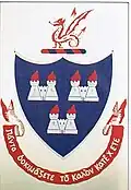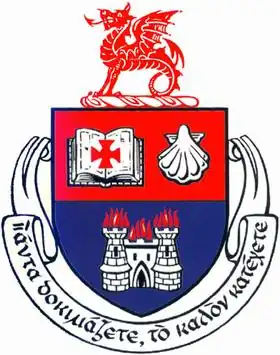 In 1969, the college obtained from the Chief Herald an official grant of arms, which replaced that previously used. The upper part of the shield has a red ground, and bears the Bible, surmounted by a Maltese cross, an old Wesley College symbol. To the right is an escallop shell from the arms of John Wesley's family. The lower part of the shield has a blue ground and on it a flaming castle from the Dublin City arms. The scroll below the shield contains the college motto in Greek, "Prove all things; hold fast that which is good." (I Thessalonians 5.21)[6]