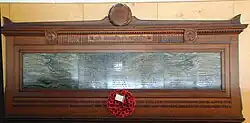 Wesley, like many other schools in Ireland, contributed to the effort of the two major world wars. Over 85 students of the college died in the First World War. Their names are listed on a memorial in the college concourse which reads "This building was erected to the honour of all old boys of this College who ventured their lives for defence of home and country in the Great War and especially in loving and grateful memory of those who fell". (The building mentioned was the old College Chapel, where the memorial was located before the move to Ballinteer.) 25 students of Wesley, including one German, died between 1939 and 1945 in the Second World War. These are also listed on a memorial in the main concourse. Remembrance Day is marked each year with the laying of a wreath on the memorial.