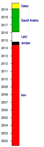 The founding members of the West Asian Football Federation are Iran, Iraq, Jordan, Lebanon, Palestine and Syria. In 2009, three more associations, Qatar, United Arab Emirates and Yemen, joined the federation. Four other West Asian nations, Bahrain, Kuwait, Oman and Saudi Arabia, joined in 2010.[2] Iran left the federation on 10 June 2014, with the creation of the Central Asian Football Association.[3]