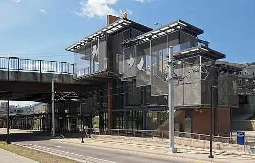West Bank station is a light rail station along the Metro Green Line in Minneapolis. It serves the West Bank campus of the University of Minnesota, as well as the Cedar-Riverside neighborhood.