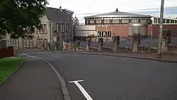 The original stone buildings have been B-listed since 1993.[3][4] When first constructed, West Coats Road did not extend south past Brownside Road, but contemporaneous with a southern extension of West Coats Road the three-storey extension was added on that side of the school; it is portrayed on the 1910 map of the area but not the 1896 version. Similarly, the railway line (Glasgow to Newton) in a deep cutting that bounds the school site to the south did not appear until that map edition.