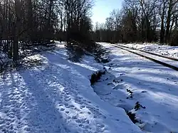 The northern trailhead is located where the Erie Lackawanna Caldwell Branch rail line split from the still active Montclair Branch.[3] Proceeding south the trail crosses County Route 612 in Little Falls at 0.2 miles.[4] One mile from the trailhead, the trail merges with the Lenape Trail before crossing Bowden Road.[4] At 1.5 miles the trail crosses the Peckman River[4] on the old railroad bridge before crossing Pompton Avenue (Route 23), where there are remnants[5] of the old Erie Railroad Cedar Grove Station[6] on the south side of the tracks[7] and stairs leading down to Pompton Avenue. The trail crosses Keeney Street in Verona at 2.4 miles. Just north of Keeney St was the Erie Railroad Overbrook Station.[8] Lastly the trail crosses Durrell Street in Verona, New Jersey at 2.7 miles before terminating at the southern trailhead located on Fairview Ave in Verona.[7] The rail bed continues through Verona passing under Bloomfield Avenue (the tunnel has since been filled in), Essex Fells and Roseland before rejoining active rail lines in Roseland at Interstate 280.[9] The trail is mixed use and available for walking, hiking, biking, and jogging. Along the trail one can find remnants of the old railroad line including mile markers, railroad ties, power lines, and signal boxes.