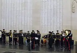 The regiment saw its first action at the Battle of Frezenberg Ridge on 13 May, when in pouring rain it made a dismounted bayonet charge that recaptured the disputed German front line trench. But having suffered substantial casualties from artillery fire, it was ordered to withdraw with the rest of the brigade. All told it suffered 51 killed, 91 wounded and 19 missing: a total of 161out of 302 who went into action. Among the dead were the CO, Lt-Col Deacon, and his acting second-in-command, Maj Roddick. Most of the dead, including Lt-Col Deacon, were buried in unmarked graves and are now commemorated on the Menin Gate Memorial to the Missing at Ypres.[45] The regiment later chose Ypres 1915 and Frezenberg as the first two Battle Honours to be emblazoned on its guidon.[6][9]