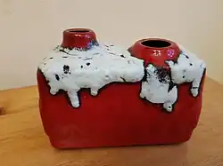 The terms Fat Lava and West German Art Pottery are often used interchangeably, but technically have a different meaning. Fat Lava refers specifically to a type of thick glazes that gives the object a thick lava-like look. This type of glaze was commonly used in this period by German pottery manufacturers. The term Fat Lava itself though is of a much more recent date. It has been suggested that the term Fat Lava first emerged with an exhibition curated by Graham Cooley during the King's Lynn Arts Festival in 2006, but the term was actually being used by sellers in Germany at least a decade earlier and may actually be due to a slightly faulty computer translation that came up with "fat" when the more accurate term would be "thick". The precise origin is likely to remain uncertain, but it definitely predates the Fat Lava exhibition and related catalog.