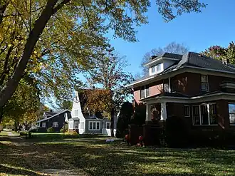 • The C.E. Stiels house at 515 W Dover St is a Colonial Revival-style house built in 1928. Hallmarks of this style are the symmetry of the front and the sidelights and fanlight above the front door. The door is also framed by an elaborate portico of fluted Ionic columns supporting a denticulated entablature capped with a classical balustrade. This house has a sunroom on one side, and half-round windows and cornice returns on the gable ends.[2] C.E. ran an insurance agency.[17] The Lebeis house up the street at 715 W Dover a simpler version, in darker brick.[18]
