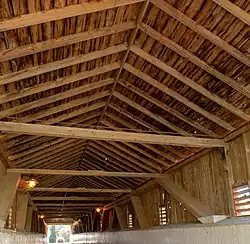 Several restorations were completed over the years. The wooden abutments were replaced with concrete some time after 1900.[7] In 1904, new planks were laid over the oak floor. New wooden trusses were installed in 1933. In 1955, part of the floor was replaced and covered with crushed stone. In 1959, parts from an old Bailey truss bridge were used to replace the internal structure; metal parts were hidden by pine panels. The roof was re-shingled in 1987 and some beams were replaced in 1995 and 1996.[10] In late 2012 to early 2013, a floor beam replacement and some roof repairs were completed.[11][12]